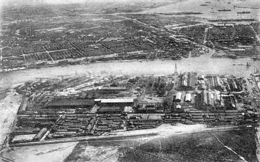 市電櫻島下車、櫻島南之町にあり。敷地約二、六四五アール、造船臺五臺を備へ、一萬噸型各二隻、六千二百噸型一隻を同時に建造するを得、船渠(ドック)は八千噸級のものを容れるに足る。艦船の外、車輛、橋桁等も製造する。
