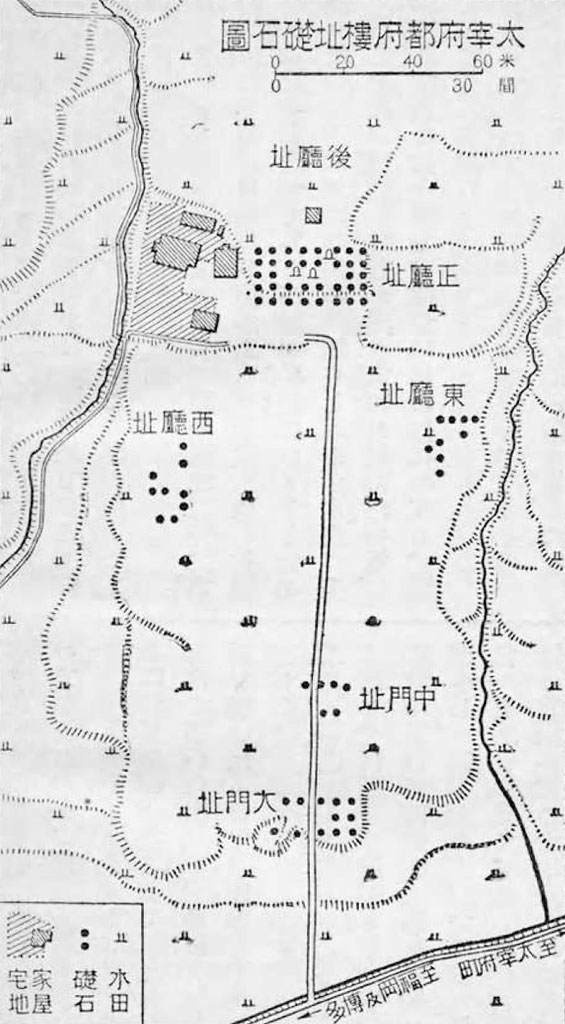 その後天慶三年藤原純友の亂に累代の廳舍燒失の厄に遭ひ、府政これより衰ふるに至り、のち元弘建武の戰亂を經て應永年中に至り全く廢滅に歸した。太宰府往還を途中から北折すれば約四〇米にして大門址の碑石あり、その北約三〇米にある中門址の礎石の殘存する閒を過ぎ、更に北約一二〇米にして正廳址に達するが、その途中道の左右に東廳址竝に西廳址の遺址が存し、前者は九箇、後者は八箇の礎石が何れも殘存して居る。正廳址は一段高く、東西二九米、南北一四米の廣大なる土壇上に、三十六箇の雄偉にして精巧を極め、二重、三重に圓柱座の造出を有する礎石が整然として遺存して居るが、石材は花崗岩、大いさ徑二米內外に達し、圓柱座は何れも徑七五糎(二尺五寸)を有して居る。重層の廳舍甍を連ねて偉觀を極めた所謂都府樓の中心建物の在つた遺址である。西廳址の西方にある丘上には最近拓かれた太宰府藏司の遺址と稱せられる礎石群が露出して居る。現今正廳址土壇の西側に設けられて居る古瓦參考館には、奈良時代から鐮倉時代に及ぶ、各時代の遺瓦、甎、埴瓮土器(土師器)、齋瓮土器(陶器)、瓷器(磁器)その他の出土品を陳列して居る。尙正廳址には寬政元年龜井南溟の撰文で同人の書に成る「太宰府碑」その他二基の碑が建つて居る。